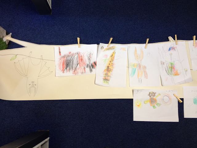 with the first school we read the book then talked about animals at the zoo while i did a few drawings for them. they then created a huge picture with me, all drawing whatever animal from the zoo they wanted so we could hang them upside down on a branch...as is the theme of the book. the school had been really brilliant and done so may lovely things with my book and the children. when i turned up there were bat and lion masks, little bat models and amazing bat handprints. so sweet to see!